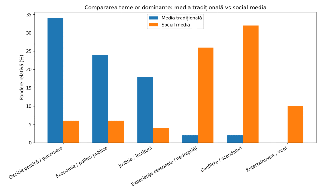 Aceste tipologii tematice oferă cadrul analitic utilizat în capitolele următoare pentru a compara modul în care media tradițională și social media prioritizează diferite tipuri de subiecte și pentru a evidenția diferențele structurale dintre cele două agende publice.